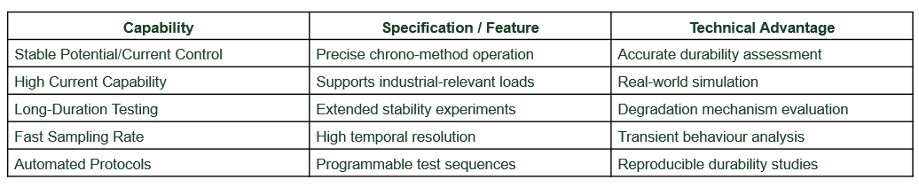 Solution → Chronoamperometry (CA) and Chronopotentiometry (CP) apply a constant potential or a constant current, respectively, to evaluate the time-dependent stability, durability, and degradation mechanisms of electrochemical systems.