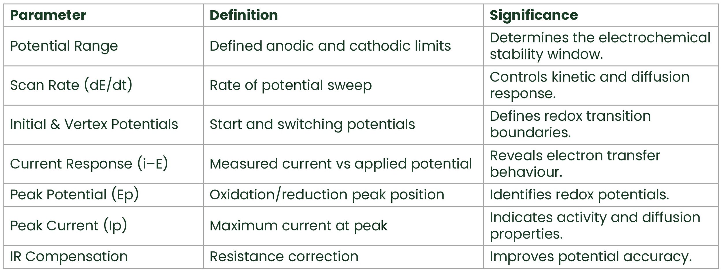 It reveals redox behaviour, reaction reversibility, electron-transfer kinetics, stability limits, and catalytic activity, allowing materials and devices to be optimized before real-world failure.
