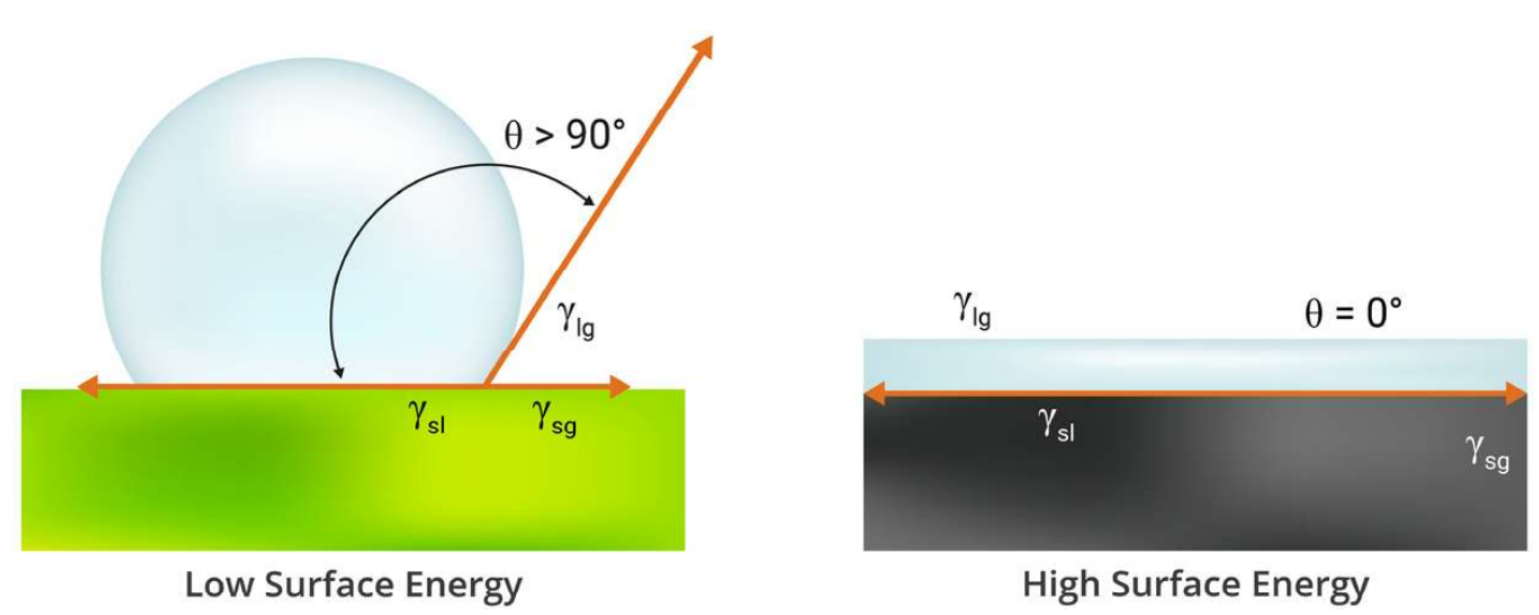 Higher Surface Energy: The surface has a strong "pull" or attractive force, overpowering the liquid's internal cohesion and forcing it to spread out. Higher surface energy typically leads to a lower contact angle.