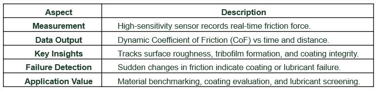 the coefficient of Friction (CoF) of metallic materials and hard coatings,