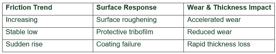 The progressive reduction in coating thickness is monitored by tracking the vertical displacement of the specimen holder during testing. As material is removed due to sliding contact, the system records micron-level changes in sample height, enabling direct determination of thickness loss.